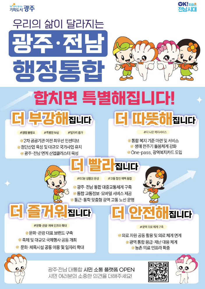 현재 광주광역시와 전라남도에서는 광주·전남특별시(가칭) 대통합을 추진하고 있습니다.