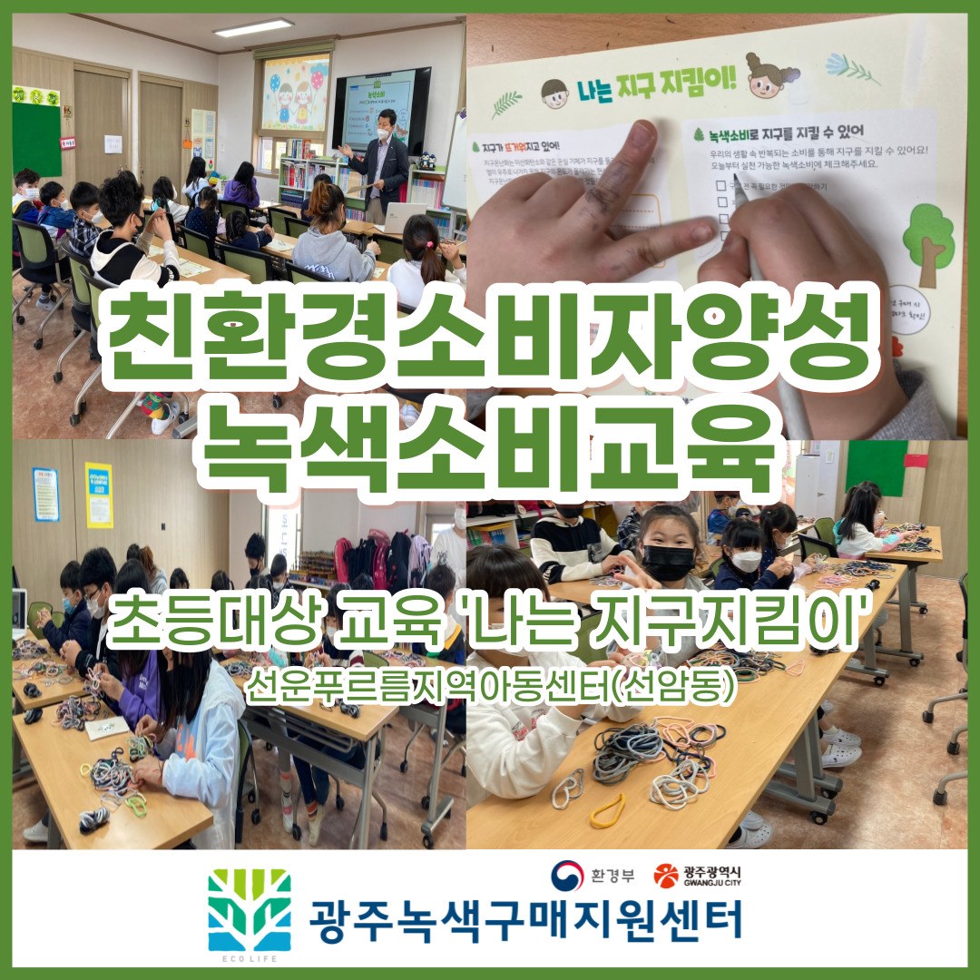 4월 13일(화), 선운푸르름지역아동센터에서 초등대상교육 '나는지구지킴이' 주제로 녹색소비교육이 진행되었습니다. 친환경교육을 통해 환경문제 인식 및 지속가능한 소비 가치관을 형성하는 시간을 가졌습니다. 교육주제와 관련있는 녹색소비와 새활용을 이해하고, 체험중심 교육을 통해 생활 속 지속가능한 친환경생활을 실천해보도록 배우는 시간을 가졌습니다. 이번 교육을 통해 미래세대인 어린이들이 녹색소비에 대해 인지하고 친환경을 실천하기를 바랍니다.