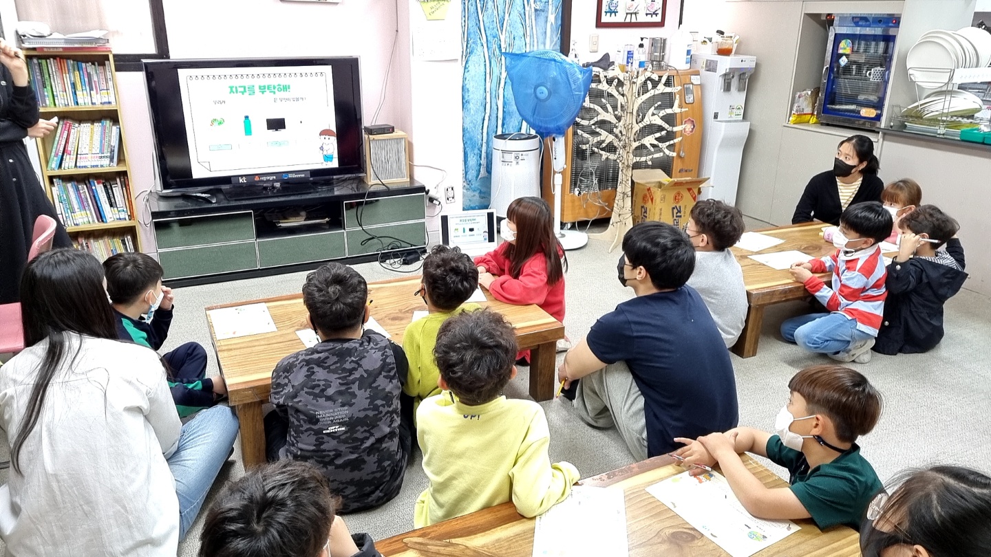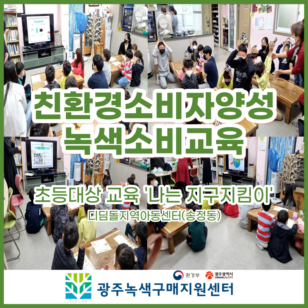 4월 15일(목), 디딤돌지역아동센터에서 초등대상교육 '나는지구지킴이' 주제로 녹색소비교육이 진행되었습니다. 친환경교육을 통해 환경문제 인식 및 지속가능한 소비 가치관을 형성하는 시간을 가졌습니다. 교육주제와 관련있는 녹색소비와 새활용을 이해하고, 체험중심 교육을 통해 생활 속 지속가능한 친환경생활을 실천해보도록 배우는 시간을 가졌습니다. 이번 교육을 통해 미래세대인 어린이들이 녹색소비에 대해 인지하고 친환경을 실천하기를 바랍니다.